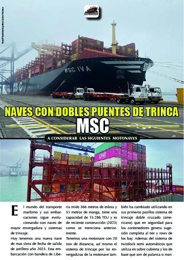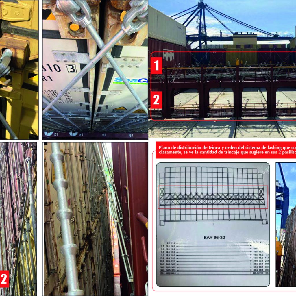 Tenemos pasillos superiores con trinca doble cruzada y el inferior con trinca simple cruzada de banda a banda. En sí se debe ir mejorando a medida que las naves crecen, también la cantidad de dotación. Es de suma importancia dentro de este aspecto de la cultura general naviera que involucra el transporte de contenedores saber los tipos de naves que van recalando y sus características especiales ya sea de estructura como de sistema de sujeción o trincaje.