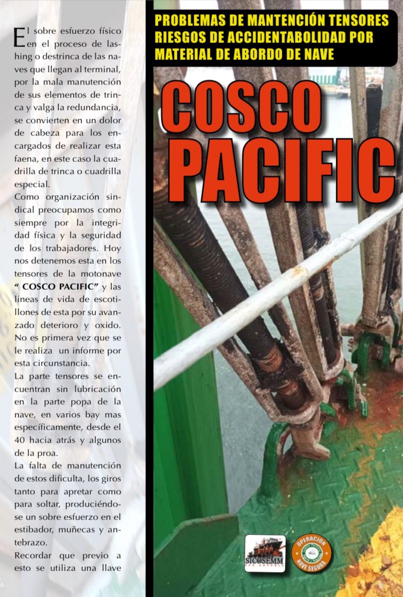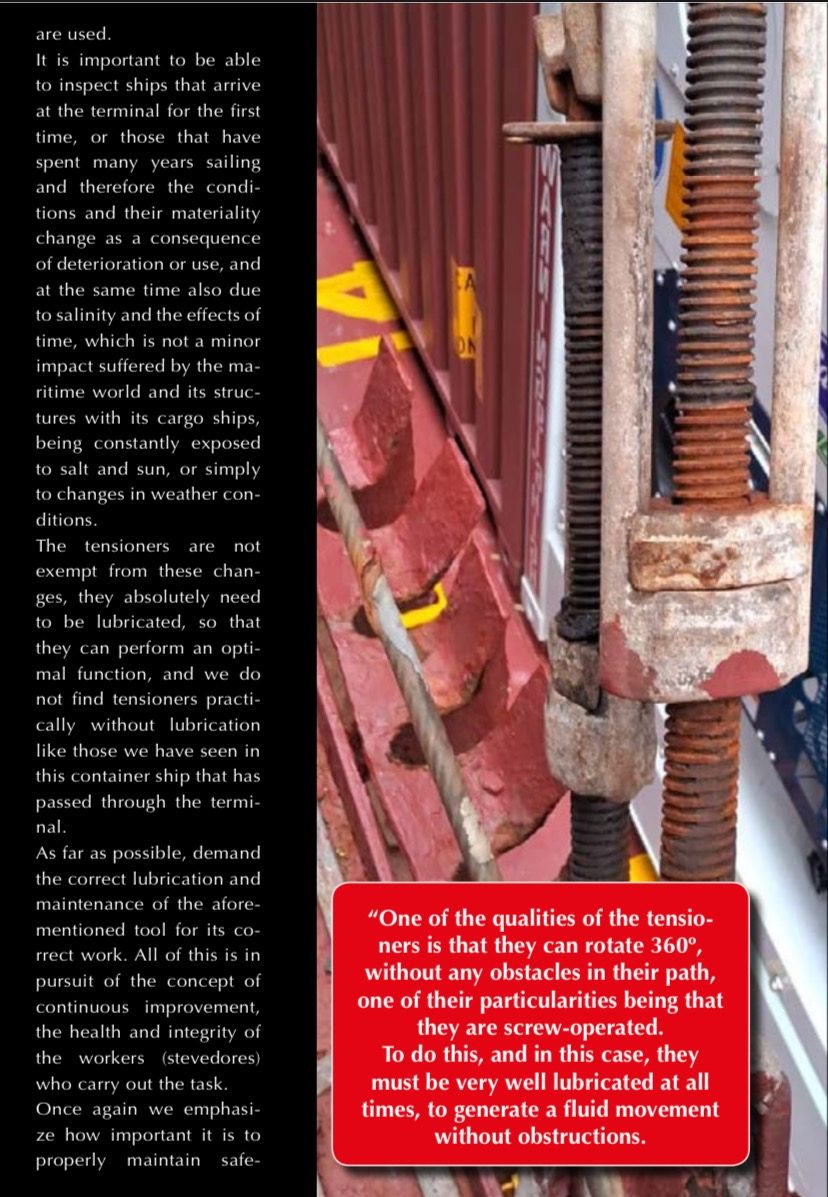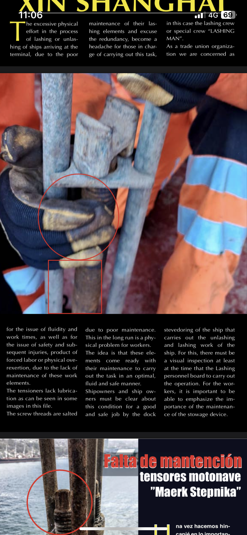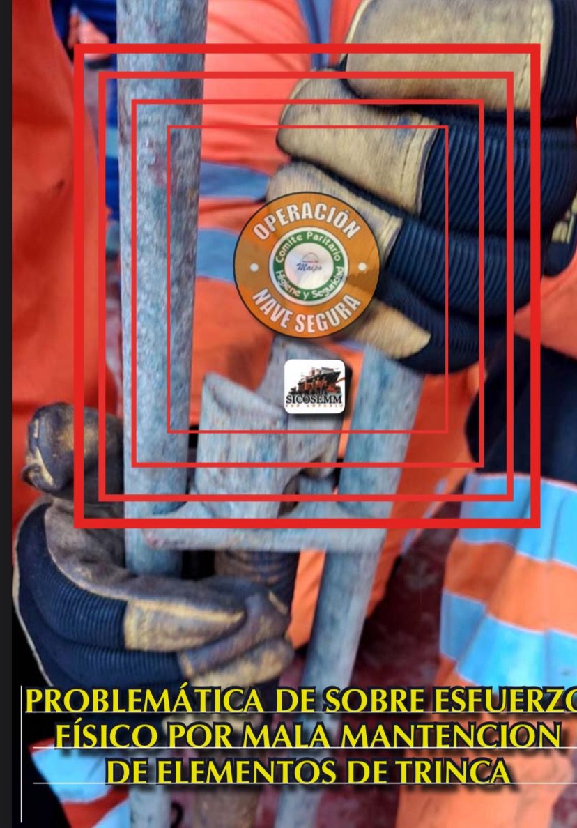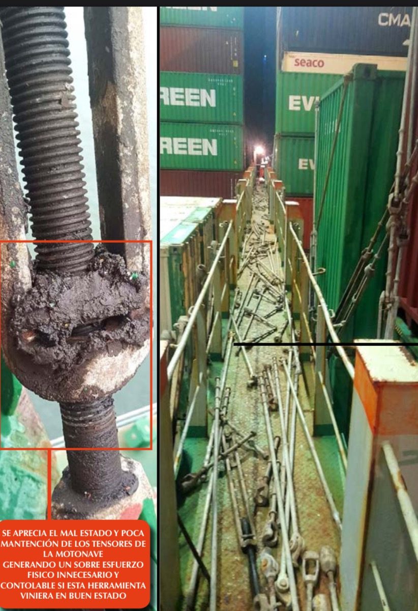 un tema operacional netamente relacionado al mantenimiento de los artilugios de estiba abordo de algunas naves que el terminal atiende y que se está transformando en un tema de salud física a los estibadores (lashingman), ya que ese sobre esfuerzo es traspasado a ellos, al no tener mantención esto a la larga se puede transformar en una enfermedad física.
